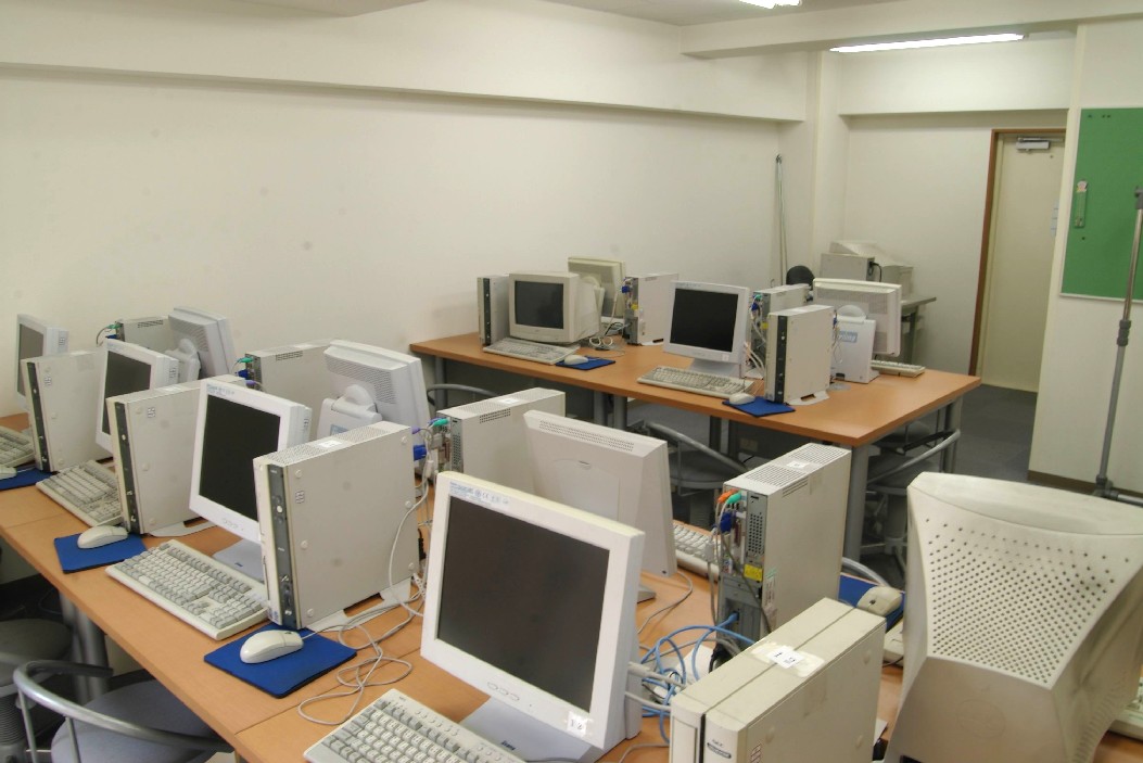 Computer lab, almost empty. These computers have flat screens, plenty of USB ports, internet access, CD drives, and software such as Word and Excel.