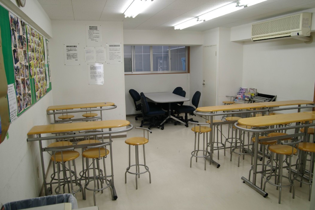 The student lounge, where students eat, drink, and chat. Onsite vending machines plus local stores nearby. Obento is a favorite. Bulletin board posts pics of recent school events and co-curricular activities.